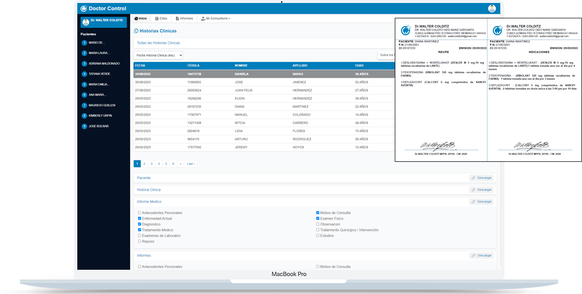 Realice historias clínicas digitales, informes, recipes, ordenes, constancias.